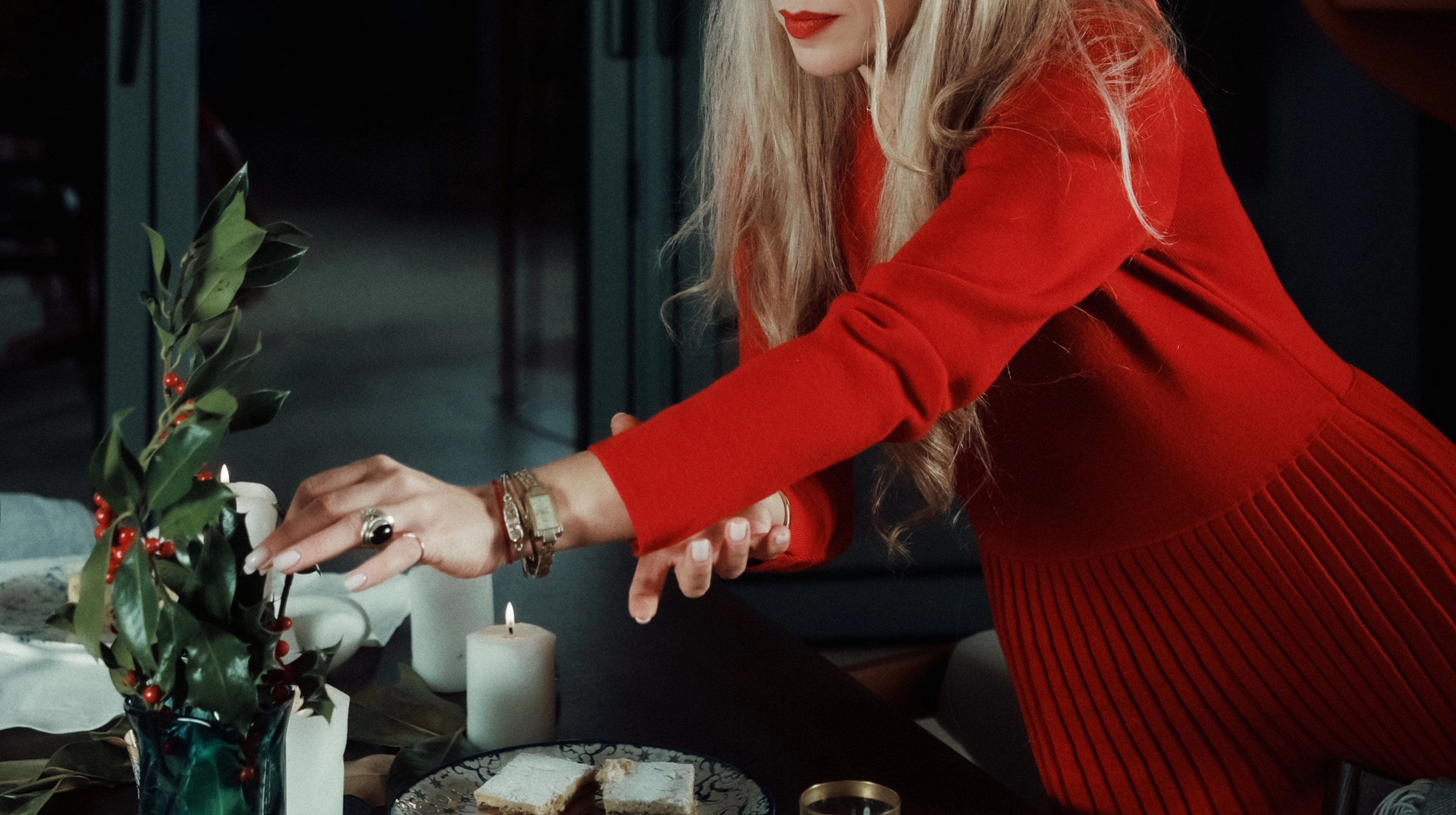 Rochie Petrecută Cu Mânecă Lungă Din In Lara Roșu Cu Buline